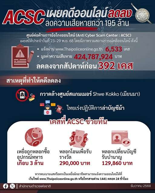 ศูนย์ต่อต้านการฉ้อโกงออนไลน์ สำนักงานตำรวจแห่งชาติ เปิดสถิติคดีออนไลน์ลดลงกว่า 392 เคส มูลค่าความเสี