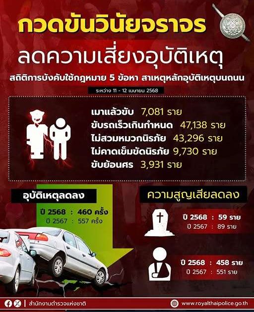สำนักงานตำรวจแห่งชาติกวดขันวินัยจราจร บังคับใช้กฎหมายอย่างเข้มข้นใน 5 ข้อหาหลัก ซึ่งเป็นสาเหตุหลักของอุบัติเหตุบนท้องถนน เพื่อความปลอดภัยของทุกคน ให้สงกรานต์ปีนี้ เป็นเทศกาลแห่งความสุข