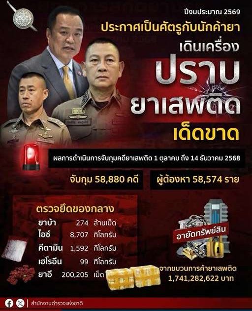 พล.ต.อ.สำราญ นวลมา รองผู้บัญชาการตำรวจแห่งชาติ ในฐานะผู้อำนวยการศูนย์อำนวยการป้องกันและปราบปรามยาเสพติด สำนักงานตำรวจแห่งชาติ (ผอ.ศอ.ปส.ตร.) เปิดเผยผลการดำนินการจับกุมคดียาเสพติด ตั้งแต่วันที่ 1 ตุลาคม ถึง 14 ธันวาคม 2568