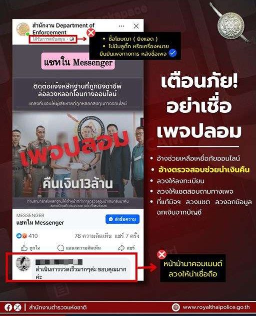 ใช้ภาพของตำรวจ หรือเจ้าหน้าที่รัฐ และมักมีหน้าม้ามาคอมเมนต์ว่าช่วยเหลือได้จริง สร้างความน่าเชื่อถือ จุดสังเกตง่าย ๆ #เพจปลอม ของมิจฉาชีพมักซื้อโฆษณา หรือยิงแอด โดยจะมีข้อความ ” ได้รับการสนับสนุน “
