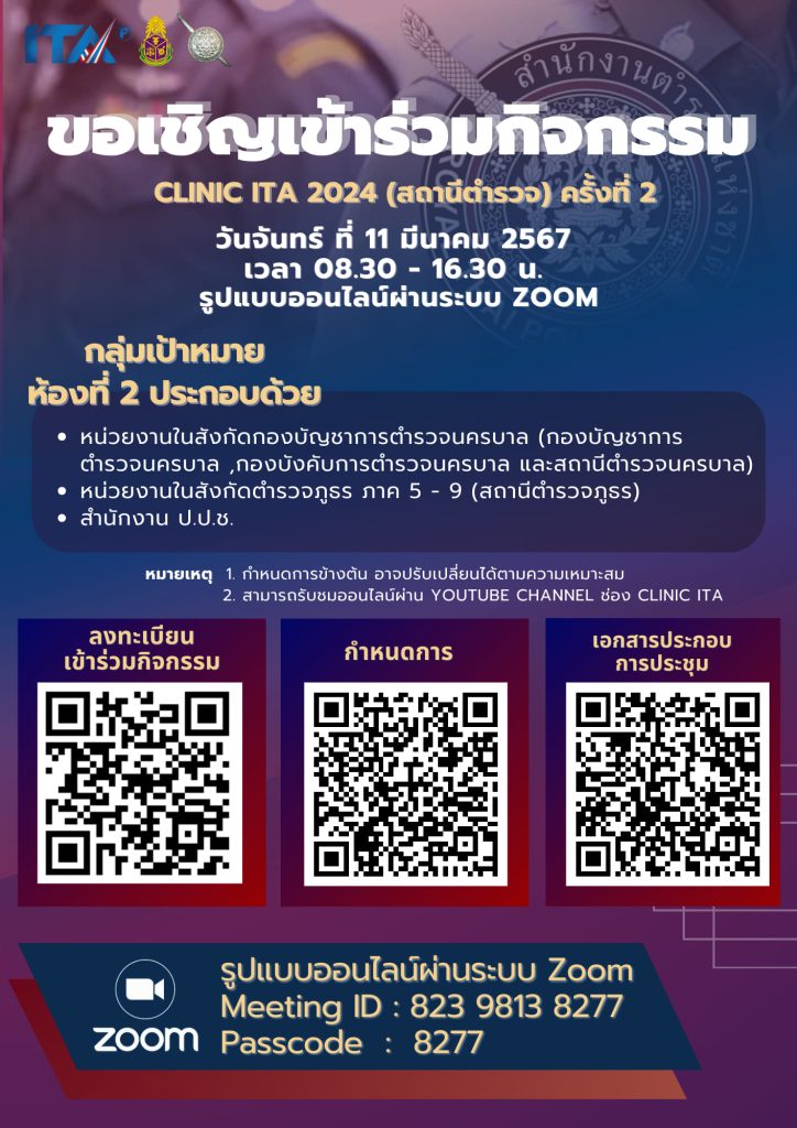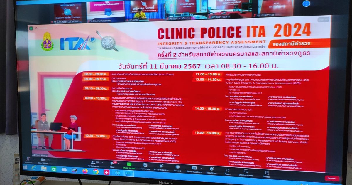 ร่วมกิจกรรม CLINIC POLICE ITA ครั้งที่ 2 ของสถานีตำรวจนครบาล และสถานีตำรวจภูธร เพื่อเตรียมความพร้อมรับการประเมินคุณธรรมและความโปร่งใสในการดำเนินของหน่วยงานภาครัฐตามแบบตรวจการเปิดเผยข้อมูลสาธารณะ OIT ประจำปีงบประมาณ พ.ศ. 2567 รูปแบบ Online ผ่านจอภาพ Video Conference/Join Zoom Meeting