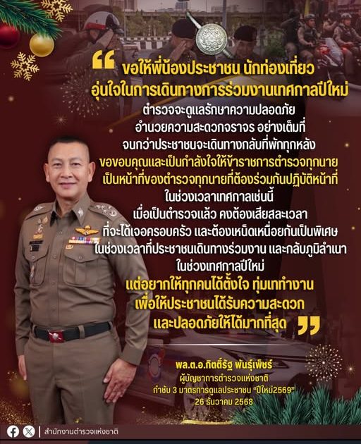 พล.ต.อ.กิตติ์รัฐ พันธุ์เพ็ชร์ ผู้บัญชาการตำรวจแห่งชาติ ขอให้พี่น้องประชาชน นักท่องเที่ยว อุ่นใจในการเดินทาง การร่วมงานเทศกาลปีใหม่