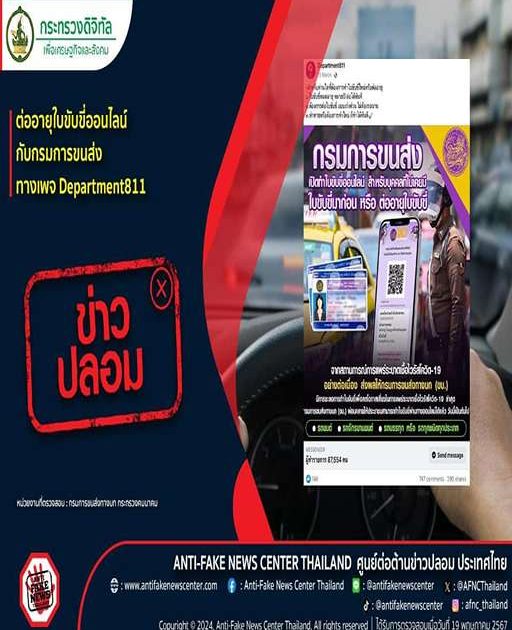 ตามที่มีประเด็นในเรื่องลงทะเบียนทำใบขับขี่ออนไลน์ ผ่านเพจศูนย์รับทำใบขับขี่ใหม่หรือต่อ ทั่วประเทศ ทางศูนย์ต่อต้านข่าวปลอมได้ดำเนินการตรวจสอบข้อเท็จจริงโดยกรมการขนส่งทางบก กระทรวงคมนาคม พบว่าข้อมูลดังกล่าว เป็นข้อมูลเท็จ