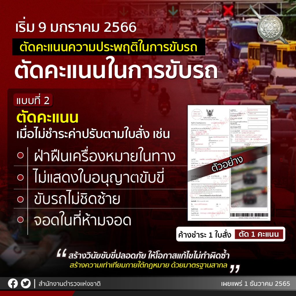 สำนักงานตำรวจแห่งชาติ โดย พล.ต.อ.ดำรงศักดิ์ กิตติประภัสร์ ผู้บัญชาการตำรวจแห่งชาติ (ผบ.ตร.) ประชาสัมพันธ์ระบบตัดคะแนนความประพฤติในการขับรถ หรือ ตัดแต้มใบขับขี่ เพื่อเสริมสร้างวินัยจราจร เป้าหมายเพื่อลดการเกิดอุบัติเหตุบนท้องถนน ซึ่งจะเริ่มบังคับใช้ในวันที่ 9 มกราคม 2566