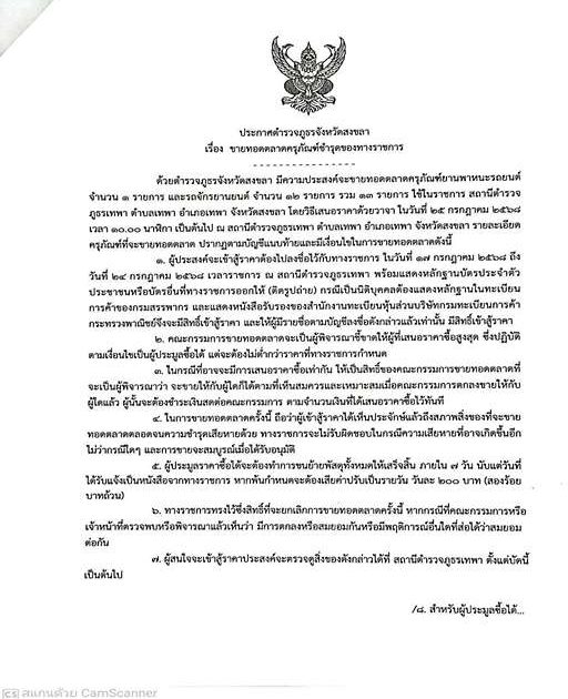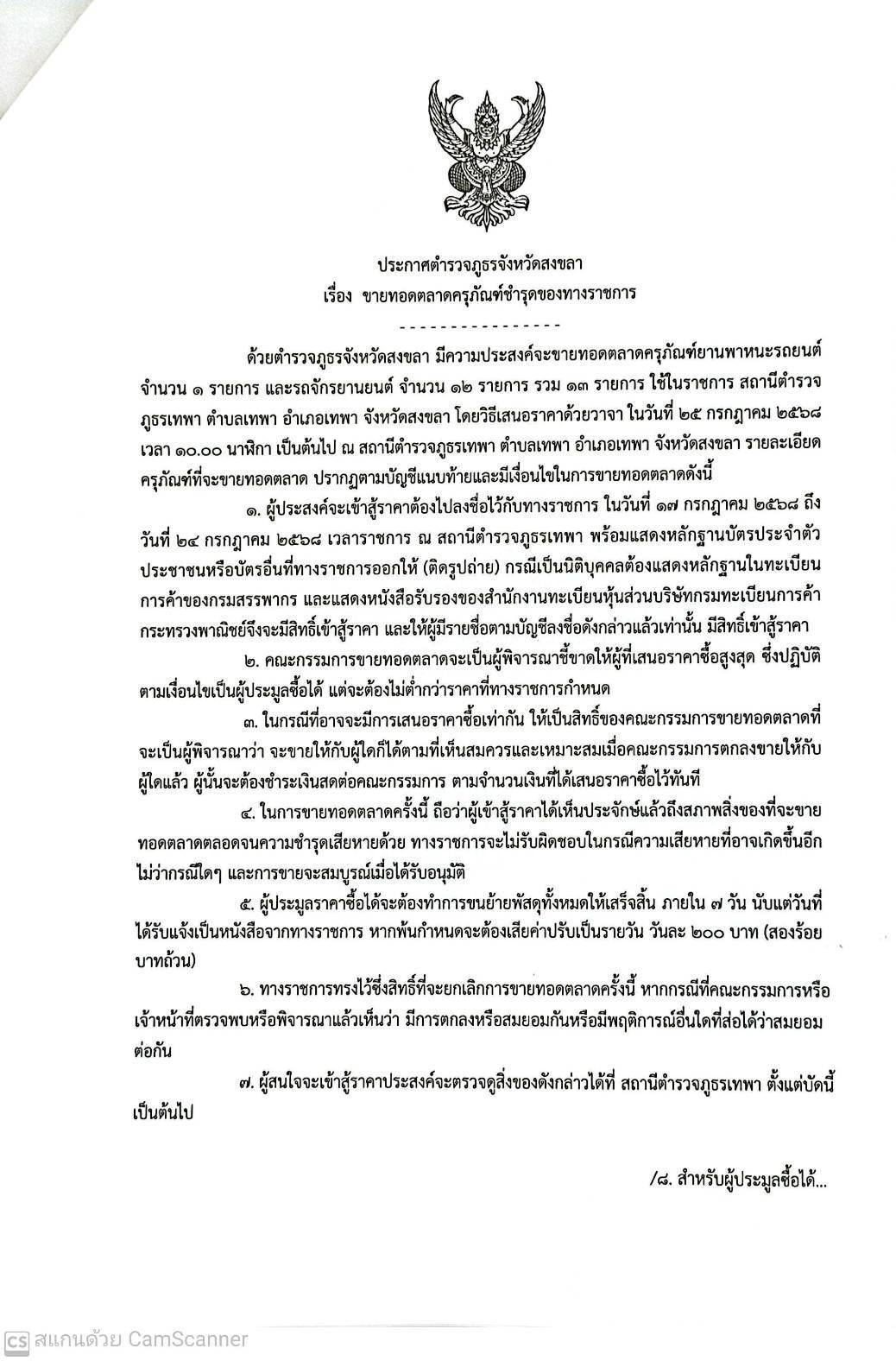 ข่าวเพื่อการเผยแพร่และประชาสัมพันธ์ (Press Release) 21 กรกฎาคม 2568 โดย thepha / ข่าวประชาสัมพันธ์,ข่าวฝากประชาสัมพันธ์ ด้วย สภ.เทพา ดำเนินการขายทอดตลาด รถจักรยานยนต์ จำนวน 12 คัน และรถยนต์ จำนวน 1 คัน บุคคลที่สนใจ ลงทะเบียนได้ที่ สภ.เทพา ภายในวันที่ 24 ก.ค. 2568 และจะทำการประมูลในวันที่ 25 ก.ค. 2568 เวลา 10.00 น. รายละเอียดตาม ประกาศตำรวจภูธรจังหวัดสงขลา เรื่อง ขายทอดตลาดครุภัณฑ์ชำรุดของทางราชการ ลง 17 ก.ค. 2568 . สภ.เทพา 0-7437-6445 เยี่ยมชม ; https://thepha.songkhla.police.go.th/