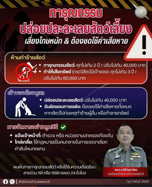 พล.ต.ต.ศิริวัฒน์ ดีพอ รองโฆษกสำนักงานตำรวจแห่งชาติ เปิดเผยว่า พล.ต.อ.กิตติ์รัฐ พันธุ์เพ็ชร์ ผู้บัญชาการตำรวจแห่งชาติ มีความห่วงใยพี่น้องประชาชน จากปัญหาความขัดแย้งระหว่างเพื่อนบ้านอันเกิดจากสัตว์เลี้ยงหลุดไปสร้างความเดือดร้อน จนนำไปสู่การใช้ความรุนแรงทารุณกรรมสัตว์ซึ่งเป็นความผิดทางอาญา