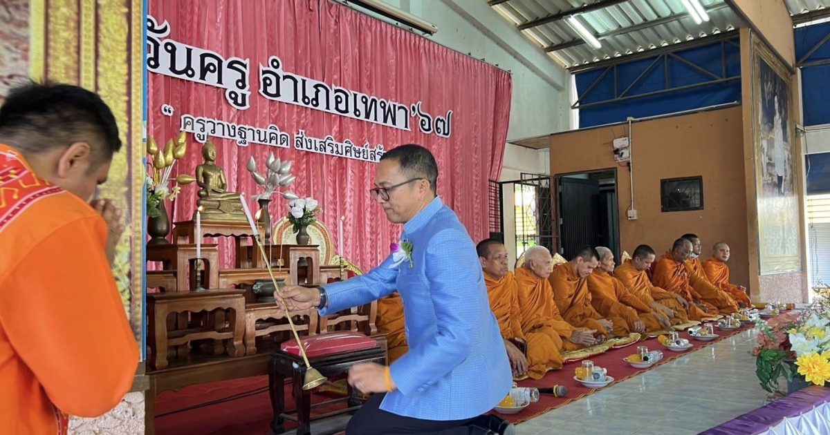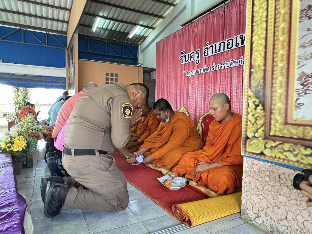 งานวันครู อำเภอเทพา 16 มกราคม 2567 โดย thepha / ข่าวประชาสัมพันธ์,ข่าวกิจกรรม เมื่อวันที่ 16 ม.ค. 2567 เวลา 09.00 น. พ.ต.อ.ธรรมรัตน์ เพชรหนองชุม ผกก.สภ.เทพา ร่วมเป็นเกียรติร่วมงานวันครูอำเภอเทพา ประจำปี 2567 โดยอำเภอเทพา และหน่วยงานทางการศึกษาในอำเภอเทพา เพื่อรำลึกพระคุณบูรพาจารย์ ยกย่องเชิดชูเกียรติข้าราชการครูและบุคลากรทางการศึกษา รักษาขนบธรรมเนียมอันดีงามไว้สืบไป ณ หอประชุมโรงเรียนเทพา ต.เทพา อ.เทพา จว.สงขลา โดยมี นายเอกชัย แก้วรัตนะ นายอำเภอเทพา เป็นประธาน ” ครูวางฐานคิด ส่งเสริมศิษย์สร้างสรรค์ “