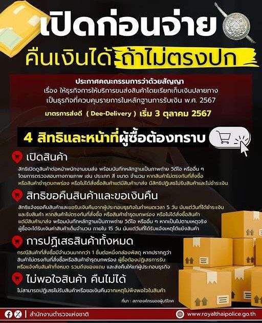 ให้สิทธิและหน้าที่ผู้ซื้อและ ผู้ให้บริการขนส่ง ป้องกันการหลอกลวงขายสินค้า ซึ่งเป็นภัยออนไลน์ ที่พบการแจ้งความผ่านระบบรับแจ้งความออนไลน์ www.thaipoliceonline.go.th มากที่สุด