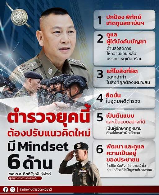 พล.ต.อ.กิตติ์รัฐ พันธุ์เพ็ชร์ ผู้บัญชาการตำรวจแห่งชาติ ( ผบ.ตร. ) กำชับในการประชุมบริหารสำนักงานตำรวจแห่งชาติ เมื่อสัปดาห์ที่ผ่านมา เน้นย้ำการปรับแนวความคิด โดยตำรวจต้องมี Mindset 6 ด้าน