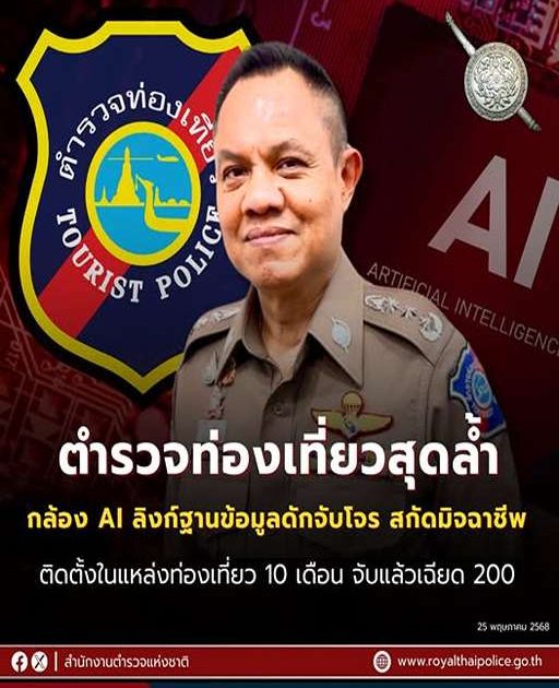 ท่องเที่ยวไทยปลอดภัย “ตำรวจท่องเที่ยว” สุดล้ำ ใช้กล้อง AI เชื่อมฐานข้อมูล ดักจับโจร สกัดมิจฉาชีพ ในแหล่งท่องเที่ยวสำคัญ 10 เดือน จับแล้วร่วม 200 ราย
