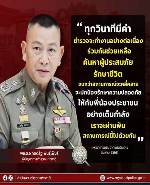 ” ทุกวินาทีมีค่า ตำรวจจะทำงานอย่างต่อเนื่อง ร่วมกันช่วยเหลือค้นหาผู้ประสบภัย รักษาชีวิต จนกว่าสถานการณ์จะคลี่คลาย จะปกป้องรักษาความปลอดภัย ให้กับพี่น้องประชาชน อย่างเต็มกำลัง เราจะผ่านพ้น สถานการณ์นี้ไปด้วยกัน “
