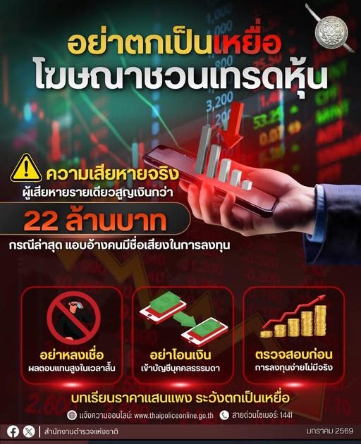 ล่าสุดเหยื่อหลงกล อุบายที่แอบอ้างเป็นนักลงทุนมีชื่อเสียงชักชวนลงทุน “ เทรด ” สูญไป 22 ล้านบาท