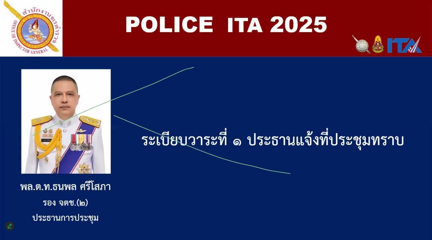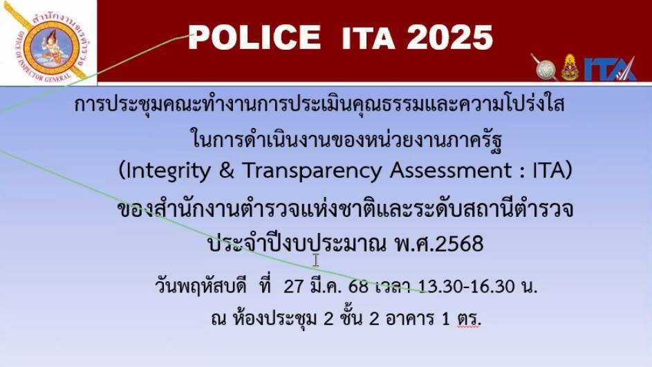 ร่วมเฝ้าฟังการประชุมคณะทำงานติดตามผลการประเมินคุณธรรมและความโปร่งใสในการดำเนินงานของหน่วยงานภาครัฐ (Integrity & Transparency Assessment : ITA) ของ สถานีตำรวจนครบาล และสถานีตำรวจภูธร ประจำปีงบประมาณ พ.ศ.2568