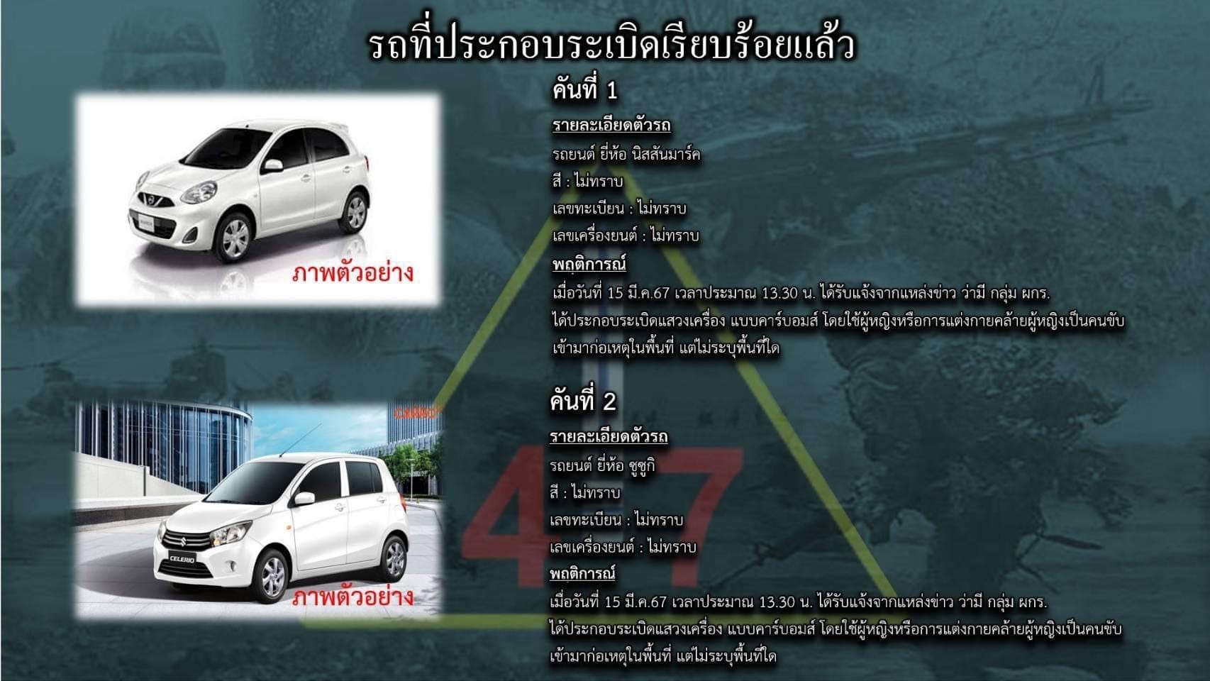 4. รถยนต์ ยี่ห้อ ซูซูกิ ไม่ทราบ สี เลขทะเบียน และเลขเครื่องยนต์