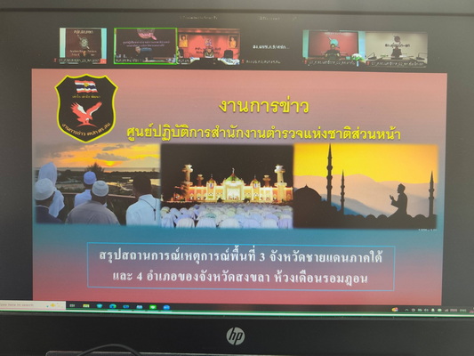 โดยมี พล.ต.อ.สำราญ นวลมา รอง ผบ.ตร. / ผบ.ศปก.ตร.สน. เป็นประธานในการประชุม จาก ห้องประชุม Warroom ชั้น 2 ศปก.ตร.สน. อ.เมืองยะลา จว.ยะลา