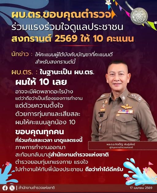 พล.ต.อ.กิตติ์รัฐ พันธุ์เพ็ชร์ ผู้บัญชาการตำรวจแห่งชาติ (ผบ.ตร.) กล่าวถึงภาพรวมการปฏิบัติช่วงเทศกาล “สงกรานต์ 2569” ที่ผ่านมาว่า ภาพรวมการดูแลพี่น้องประชาชนปีนี้ถือว่าดี โดยสถิติการเกิดอุบัติเหตุถือว่าลดลง ยอดการเสียชีวิตก็ลดลง รอง ผบ.ตร.ทุกคน และจเรตำรวจแห่งชาติ กำกับ และลงพื้นที่ไปติดตามให้กำลังใจการปฏิบัติหน้าที่อย่างต่อเนื่อง