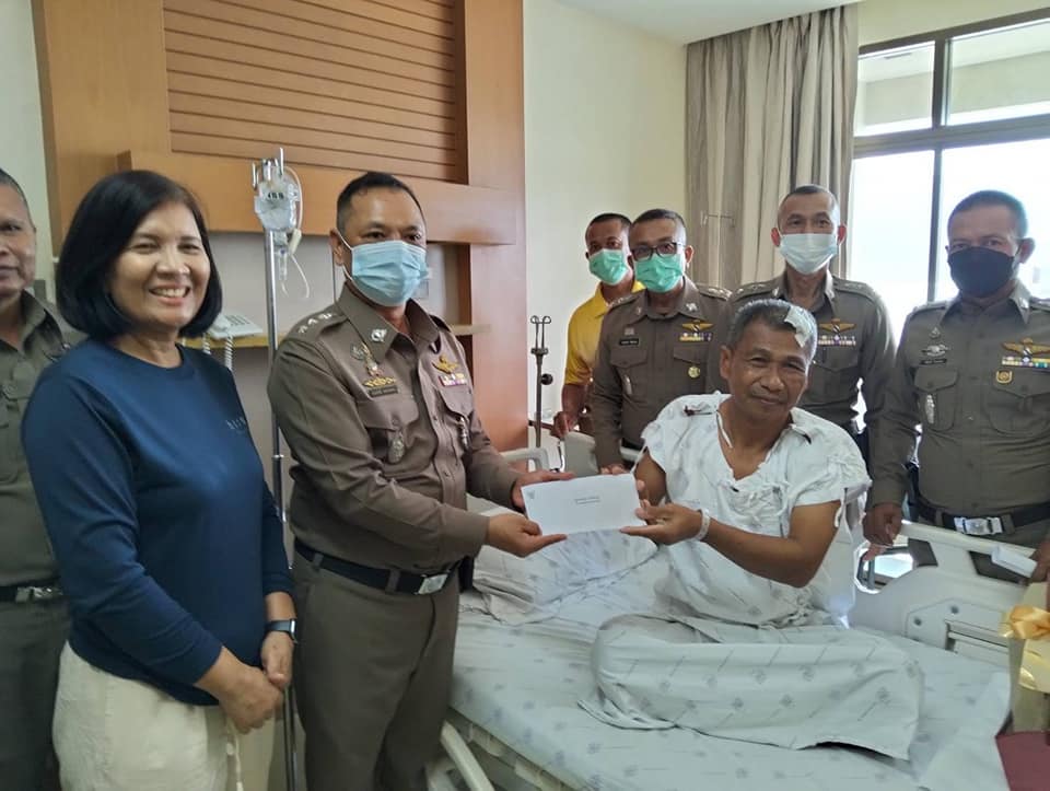 พร้อมมอบเงินบำรุงขวัญและกระเช้าสิ่งของ ซึ่งข้าราชการตำรวจในสังกัดได้ร่วมแรงร่วมใจ สละทุนทรัพย์ส่วนตัวเพื่อเป็นขวัญกำลังใจให้แก่ ผู้ที่ได้รับบาดเจ็บ จำนวน 4 นาย ดังนี้.-