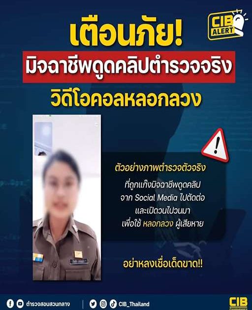 ล่าสุดตำรวจสอบสวนกลาง (CIB) พบว่ามีมิจฉาชีพนำคลิปตำรวจจริงมาหลอกลวงสร้างความน่าเชื่อถือ โดยจะวิดีโอคอลหาผู้เสียหายอ้างว่ามีส่วนเกี่ยวข้องกับการกระทำความผิด พูดคุยเกี่ยวกับเรื่องคดี หรือพยายามจะช่วยเหลือนำเงินที่ถูกหลอกไปกลับคืนมา โดยในระหว่างวิดีโอคอล มิจฉาชีพจะนำคลิปวิดีโอของตำรวจจริงที่มีการโพสต์ไว้ในช่องทางโซเชียลมีเดียต่างๆ นำมาตัดต่อและเปิดวนไปวนมาเพื่อให้เชื่อว่าบุคคลที่สนทนาอยู่ด้วยนั้นเป็นตำรวจจริง ซึ่งหากหลงเชื่อก็อาจทำให้ถูกหลอกขอข้อมูลส่วนบุคคล รวมไปถึงสูญเสียทรัพย์สินอีกด้วย
