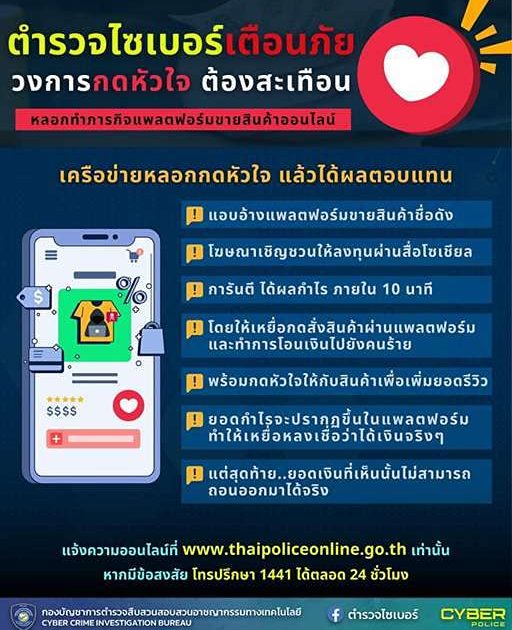 มุกใหม่มิจฉาชีพ อ้างกดหัวใจรีวิวสินค้า หลอกให้โอนตังหวังผลตอบแทน