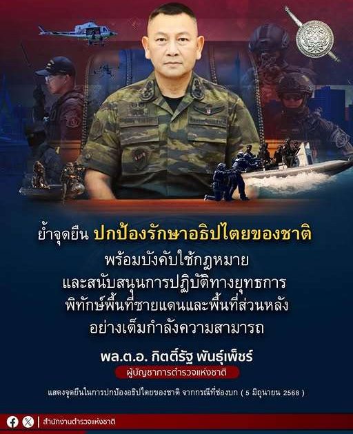 “ ย้ำจุดยืน ปกป้องรักษาอธิปไตยของชาติ ..พร้อมบังคับใช้กฎหมาย และสนับสนุนการปฏิบัติทางยุทธการ พิทักษ์พื้นที่ชายแดน และพื้นที่ส่วนหลังอย่างเต็มกำลังความสามารถ ”