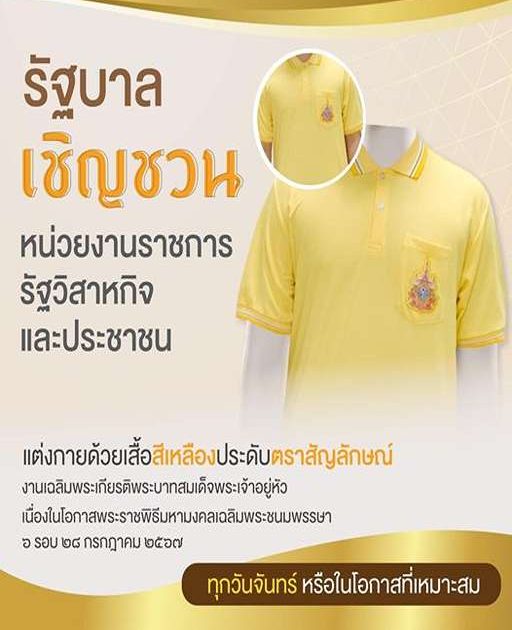 รัฐบาล จึงขอความร่วมมือให้ทุกหน่วยงานราชการ และรัฐวิสาหกิจ แต่งกายด้วยเสื้อสีเหลือง ประดับตราสัญลักษณ์ งานเฉลิมพระเกียรติพระบาทสมเด็จพระเจ้าอยู่หัว เนื่องในโอกาสพระราชพิธีมหามงคลเฉลิมพระชนมพรรษา ๖ รอบ ๒๘ กรกฎาคม ๒๕๖๗ ทุกวันจันทร์ หรือในโอกาสที่เหมาะสม ซึ่งสามารถแต่งกายแทนชุดยูนิฟอร์มของหน่วยงานได้