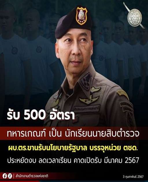 ข่าวดี!! ผบ.ตร.ขานรับนโยบายรัฐบาล เปิดรับทหารกองหนุน สอบเป็นนักเรียนนายสิบตำรวจ 500 อัตรา จบมาลงหน่วย ตชด.ทำงานชายแดนคู่หน่วยทหาร เชื่อทำให้เกิดประสิทธิภาพ และช่วยประหยัดงบประมาณ ลดเวลาเรียนลง