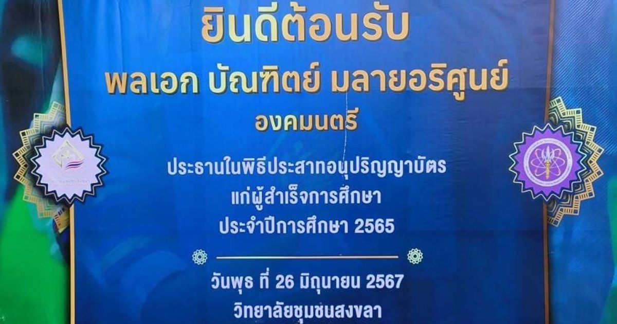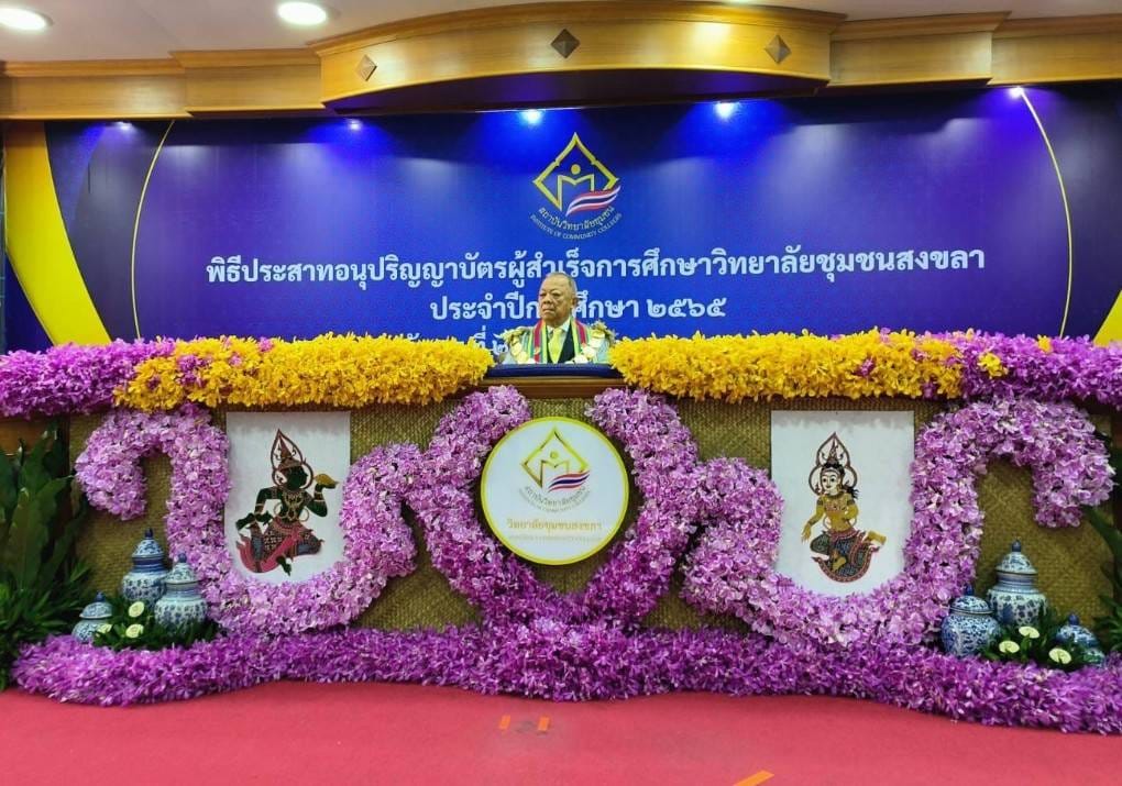 ร่วมต้อนรับ พลเอก บัณฑิตย์ มลายอริศูนย์ องคมนตรี และคณะ เดินทางมาเป็นประธานในพิธีประสาทอนุปริญญาบัตร และสัมฤทธิบัตรแก่ผู้สำเร็จการศึกษา วิทยาลัยชุมชนสงขลา ประจำปีการศึกษา 2565