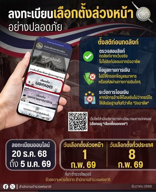 ลงทะเบียนเลือกตั้งล่วงหน้าได้ตั้งแต่ 20 ธ.ค. 2568 – 5 ม.ค. 2569 ผ่านระบบออนไลน์ได้ 24 ชั่วโมง
