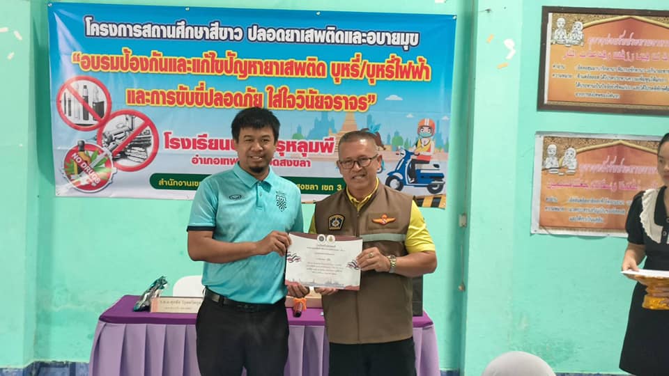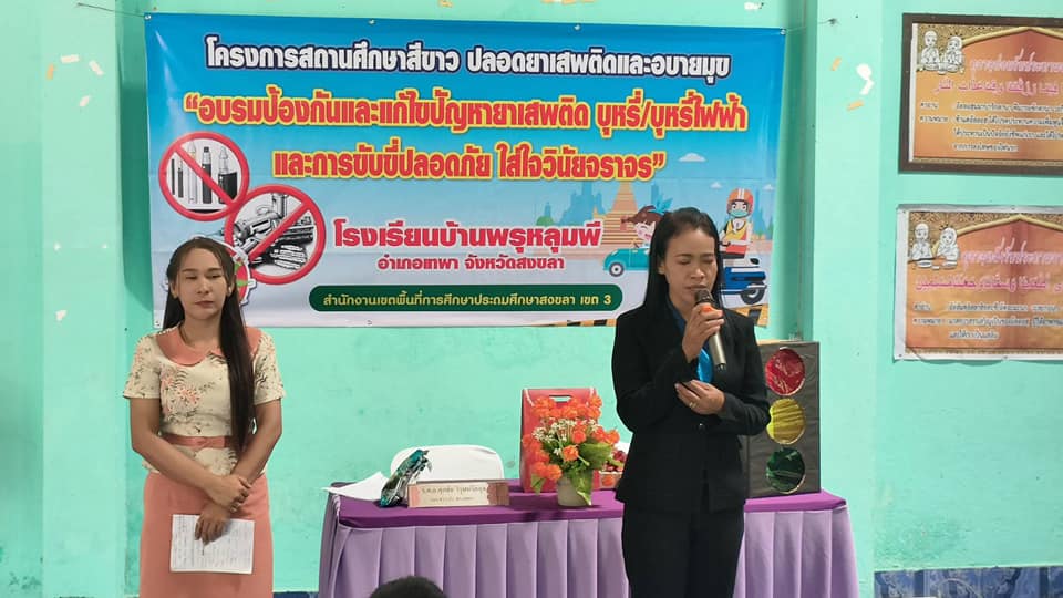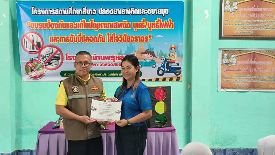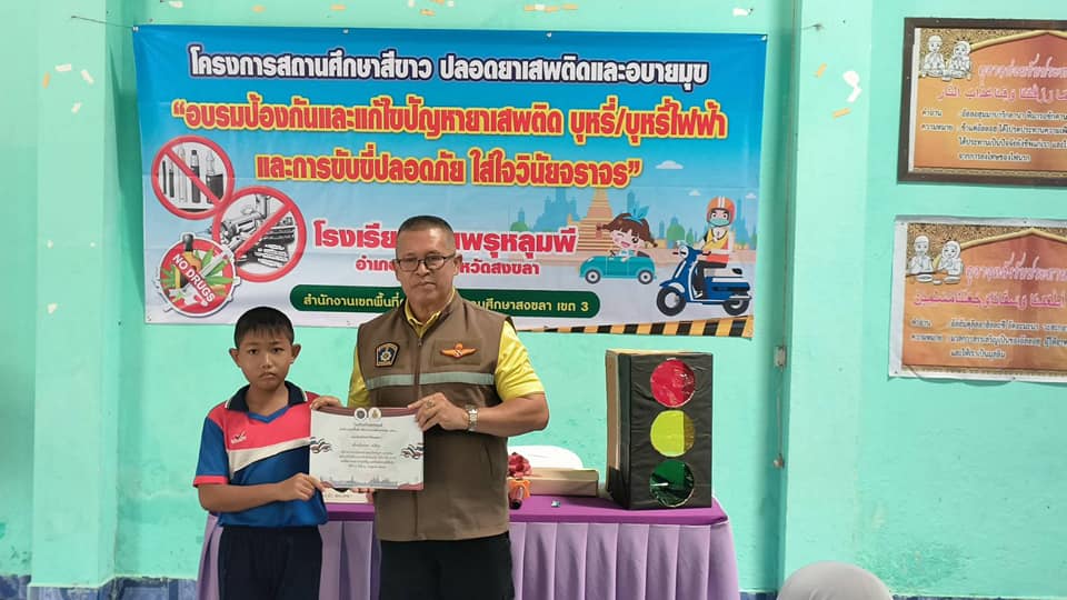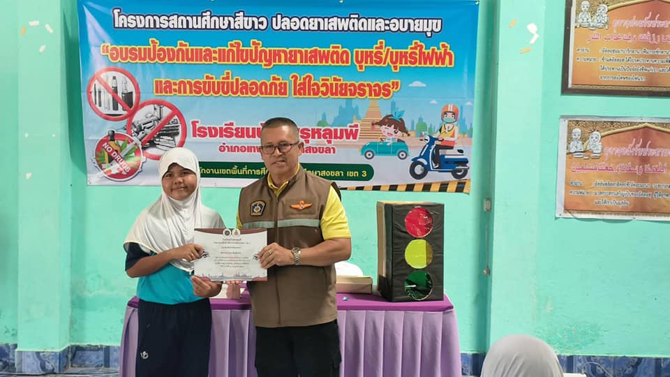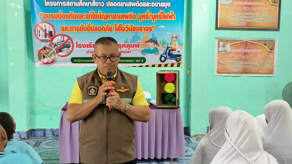 ตามโครงการสถานศึกษาสีขาว ปลอดยาเสพติดและอบายมุข ” อบรมป้องกันและแก้ไขปัญหายาเสพติด บุหรี่/บุหรี่ไฟฟ้า และการขับขี่ปลอดภัย ใส่ใจวินัยจราจร “