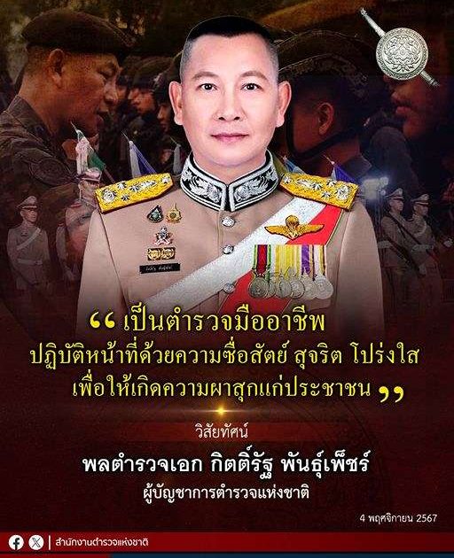 วิสัยทัศน์ ผบ.ตร. 6 พฤศจิกายน 2567 โดย thepha / ข่าวประชาสัมพันธ์,ข่าวฝากประชาสัมพันธ์ “ เป็นตำรวจมืออาชีพ ปฏิบัติหน้าที่ด้วยความ ซื่อสัตย์ สุจริต โปร่งใส เพื่อให้เกิดความผาสุกแก่ประชาชน ” . พลตำรวจเอก กิตติ์รัฐ พันธุ์เพ็ชร์ ผู้บัญชาการตำรวจแห่งชาติ . #ผู้บัญชาการตำรวจแห่งชาติ #พิทักษ์1 #วิสัยทัศน์ผบตร #สำนักงานตำรวจแห่งชาติ #RoyalThaiPolice