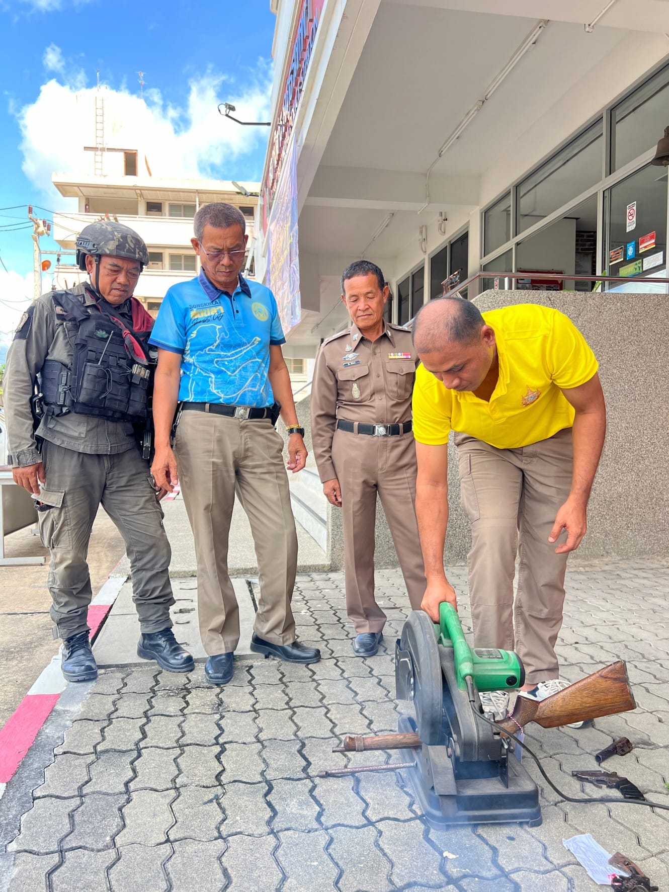 พ.ต.ท.ชิต สังข์แก้ว รอง ผกก.(สอบสวน)สภ.เทพา พร้อมด้วยคณะกรรมการทำลายอาวุธปืนของกลาง ตามคำสั่ง ภ.จว.สงขลา ที่ 750/2567 ลง 26 ส.ค. 2567