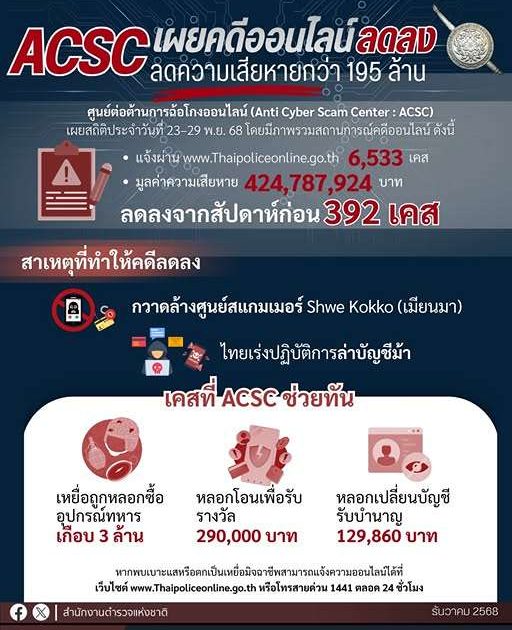 ศูนย์ต่อต้านการฉ้อโกงออนไลน์ สำนักงานตำรวจแห่งชาติ ภายใต้การอำนวยการ พล.ต.อ.ธนา ชูวงศ์ รอง ผบ.ตร./ผอ.ศปอส.ตร. และ พล.ต.ท.จิรภพ ภูริเดช ผู้ช่วย ผบ.ตร./รอง ผอ.ศปอส.ตร. เปิดสถิติคดีและความเสียหายในรอบสัปดาห์ที่ผ่านมา ตั้งแต่วันที่ 23-29 พ.ย.68 มีคดีที่รับแจ้งเข้ามาผ่านทาง www.Thaipoliceonline.go.th จำนวน 6,533 เคส มูลค่าความเสียหาย 424,787,924 บาท ซึ่งคดีที่รับแจ้งลดลงจากห้วงวันที่ 16-22 พ.ย.68 จำนวน 392 เคส และมูลค่าความเสียหายลดลง 195,750,710 บาท