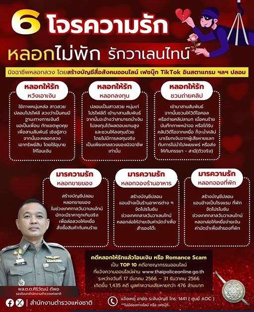 สำนักงานตำรวจแห่งชาติ ขอให้พี่น้องประชาชนอย่าหลงเชื่อในสิ่งที่ราคาถูกหรือดูดีเกินจริง และมัดระวัง “6 โจรความรัก” 6 รูปแบบ กลลวงของมิจฉาชีพในการหลอกลวงแสวงหาประโยชน์จากพี่น้องประชาชนในช่วงเทศกาลวันวาเลนไทน์