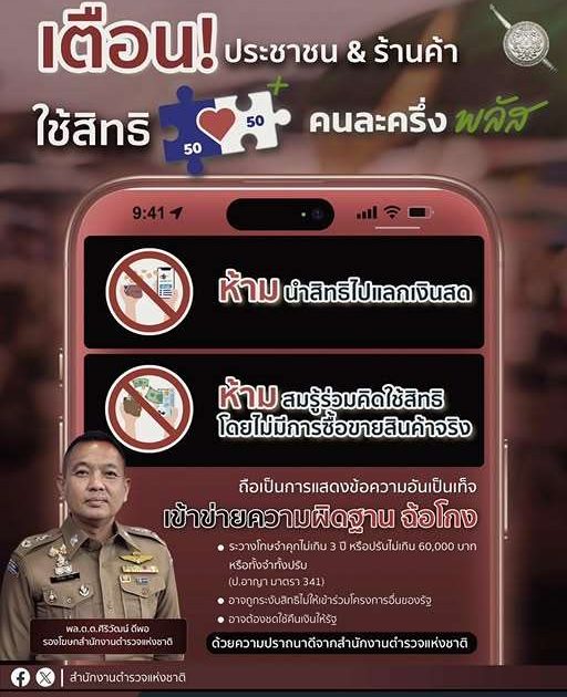 สำนักงานตำรวจแห่งชาติ จึงขอเตือนพี่น้องประชาชนที่ได้รับสิทธิคนละครึ่งพลัส ห้ามนำสิทธิดังกล่าวไปขายต่อให้กับบุคคลอื่น หรือใช้สิทธิโดยไม่มีการซื้อ-ขายสินค้าจริง เนื่องจากเข้าข่ายเป็นความผิดตามกฎหมาย