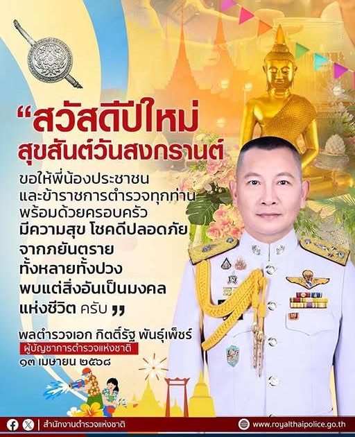 “ สวัสดีปีใหม่ สุขสันต์วันสงกรานต์ ขอให้พี่น้องประชาชนและข้าราชการตำรวจทุกท่าน พร้อมด้วยครอบครัว มีความสุข โชคดีปลอดภัยจากภยันตรายทั้งหลายทั้งปวง พบแต่สิ่งอันเป็นมงคลแห่งชีวิต ครับ ”