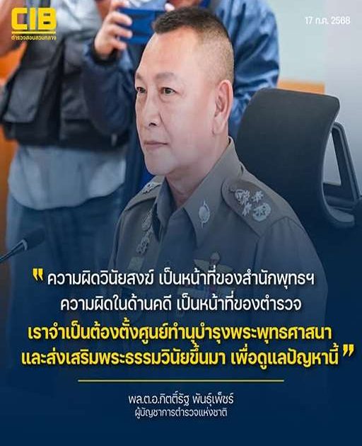 พล.ต.อ.กิตติ์รัฐ พันธ์ุเพชร ผบ.ตร. กล่าวถึงกรณีจัดตั้งศูนย์ทำนุบำรุงพระพุทธศาสนาและส่งเสริมพระธรรมวินัย ณ ตำรวจสอบสวนกลาง (CIB) เมื่อวันที่ 17 ก.ค.68