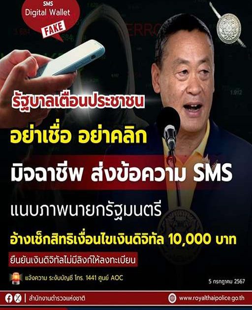 เมื่อวันที่ 5 กรกฎาคม 2567 นายชัย วัชรงค์ โฆษกประจำสำนักนายกรัฐมนตรี ย้ำเตือนประชาชนอย่าหลงมิจฉาชีพแอบอ้างส่งรูปนายเศรษฐา ทวีสิน นายกรัฐมนตรี พร้อมข้อความเช็คสิทธิเงื่อนไขเงินดิจิทัล 10,000 บาท ส่งไปทาง SMS หากประชาชนได้รับข้อความดังกล่าวพร้อมรูปนายกรัฐมนตรี อย่ากดลิงก์เข้าไปดูโดยเด็ดขาด หากกดเข้าไประบบจะถูกล็อก มิจฉาชีพจะดูดเงินในบัญชีธนาคาร ทำให้สูญเสียเงินทั้งบัญชี