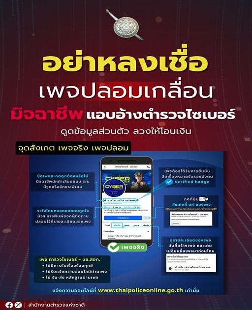 • คนร้ายสร้างเพจเฟซบุ๊กปลอมขึ้นมาโดยตั้งชื่อเพจเป็นหน่วยงานตำรวจหรือศูนย์ช่วยเหลือเหยื่ออาชญากรรมทางเทคโนโลยี