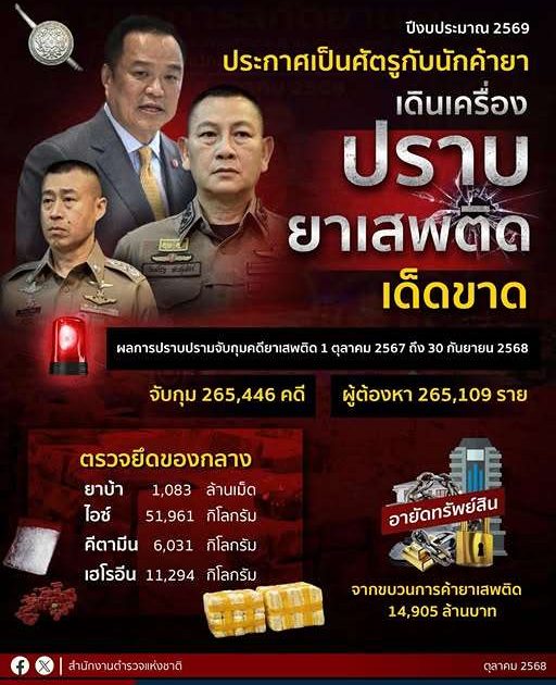 สำนักงานตำรวจแห่งชาติ เปิดเผยผลการปราบปรามจับกุมคดียาเสพติด ตั้งแต่ 1 ตุลาคม 2567 ถึง 30 กันยายน 2568