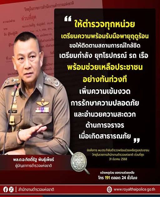 ผบ.ตร.กำชับให้ติดตามสถานการณ์ใกล้ชิด เตรียมกำลัง ยุทโธปกรณ์ ยานพาหนะ รถ เรือ พร้อมช่วยเหลือประชาชน อย่างทันท่วงที เพิ่มความเข้มงวดในการรักษาความปลอดภัย และอำนวยความสะดวกด้านการจราจรเมื่อเกิดสาธารณภัย โดยกำชับให้ดูแลตำรวจและครอบครัวที่ได้รับผลกระทบด้วย