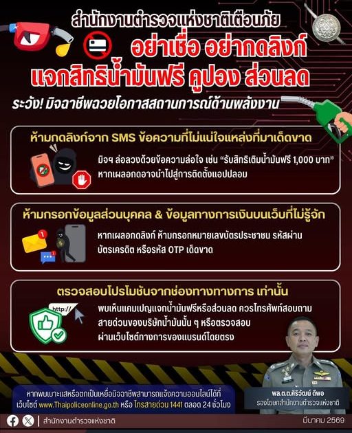 วันนี้ (15 มีนาคม 2569) พล.ต.ต.ศิริวัฒน์ ดีพอ รองโฆษกสำนักงานตำรวจแห่งชาติ เปิดเผยว่า พล.ต.อ.กิตติ์รัฐ พันธุ์เพ็ชร์ ผู้บัญชาการตำรวจแห่งชาติ (ผบ.ตร.) มีความห่วงใยพี่น้องประชาชนจาก ภัยคุกคามทางออนไลน์ที่มิจฉาชีพฉวยโอกาสจากสถานการณ์ความขัดแย้งและสงครามในต่างประเทศ ซึ่งส่งผลกระทบต่อความกังวลเรื่องราคาพลังงาน