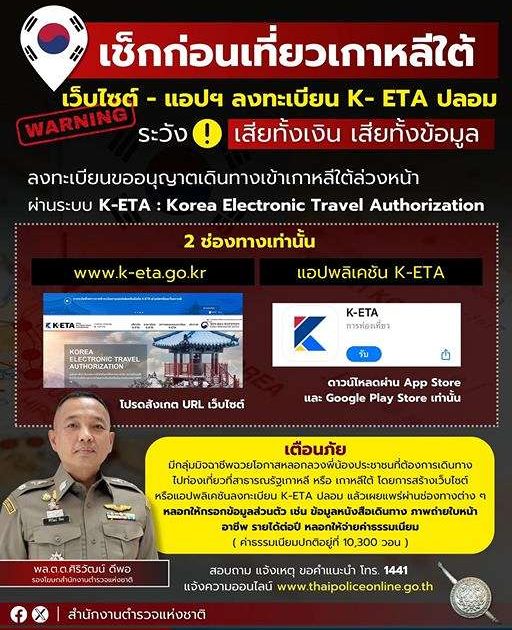 สำนักงานตำรวจแห่งชาติ จึงขอเตือนพี่น้องประชาชนให้ระมัดระวังในการลงทะเบียน K-ETA เพื่อเดินทางไปท่องเที่ยวที่ประเทศเกาหลีใต้ โดยขอให้ตรวจสอบก่อนว่าเว็บไซต์และแอปพลิเคชันที่ใช้ลงทะเบียน เป็นของจริงหรือไม่