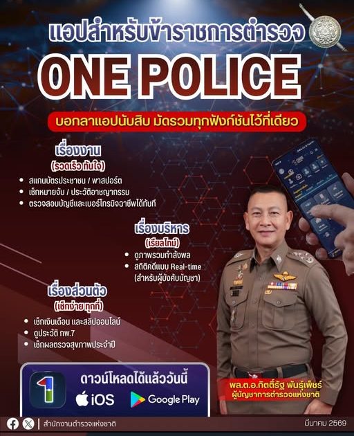 วันนี้ (26 มีนาคม 2569) พล.ต.ท.ยิ่งยศ เทพจำนงค์ ผู้ช่วยผู้บัญชาการตำรวจแห่งชาติ ในฐานะโฆษกสำนักงานตำรวจแห่งชาติ เปิดเผยว่า พล.ต.อ.กิตติ์รัฐ พันธุ์เพ็ชร์ ผู้บัญชาการตำรวจแห่งชาติ (ผบ.ตร.) เล็งเห็นถึงความสำคัญของปัญหาจากการใช้งานแอปพลิเคชันหน่วยงานต่าง ๆ ของสำนักงานตำรวจแห่งชาติ ที่มีอยู่เป็นจำนวนมาก ซึ่งอาจเกิดความซ้ำซ้อนและไม่สะดวกต่อการใช้งาน จึงสั่งการให้รวบรวมแอปพลิเคชันของหน่วยงานต่าง ๆ นำมารวมไว้ในแอปพลิเคชันเดียว เพื่อรองรับการใช้งานอย่างครบถ้วน และให้ข้าราชการตำรวจสามารถใช้งานฟังก์ชั่นต่าง ๆ ได้อย่างสะดวกมากขึ้น เปิดตัวแอปพลิเคชัน “OnePolice” ซึ่งเป็นแพลตฟอร์มดิจิทัลแบบ One Stop Service ของสำนักงานตำรวจแห่งชาติ ที่รวบรวมแอปพลิเคชันและบริการต่าง ๆ ไว้ในที่เดียว เพื่อให้ข้าราชการตำรวจทั่วประเทศได้ใช้งานในการสืบค้นข้อมูลส่วนบุคคล รวมทั้งฟังก์ชั่นการทำงานในการตรวจสอบข้อมูลคนร้ายและมิจฉาชีพ