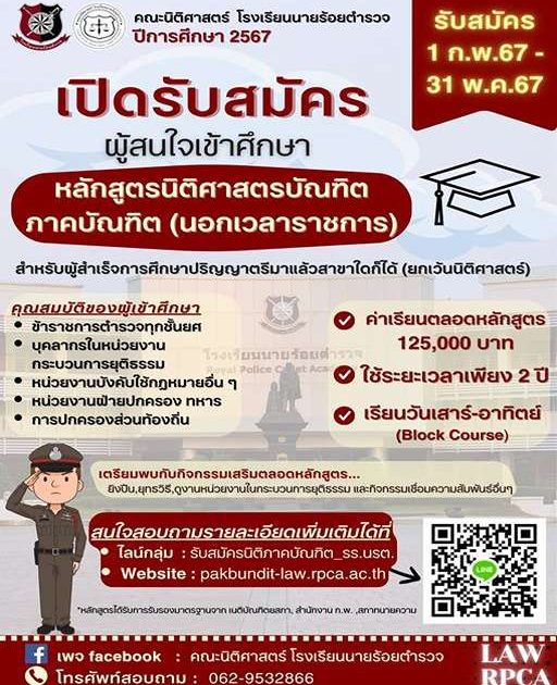 เปิดรับสมัครบุคคลภายนอก เข้าศึกษา ระดับปริญญาตรี 12 กุมภาพันธ์ 2567 โดย thepha / ข่าวประชาสัมพันธ์,ข่าวฝากประชาสัมพันธ์ โรงเรียนนายร้อยตำรวจ เปิดรับสมัครบุคคลภายนอก เข้าศึกษา ระดับปริญญาตรี หลักสูตรนิติศาสตรบัณฑิต ภาคบัณฑิต (นอกเวลาราชการ) ดูรายละเอียดและสมัคร ได้ที่ https://pakbundit-law.rpca.ac.th/ . หรือ สอบถามเพิ่มเติม ไลน์ line.me/R/ti/g/YJbS8-2ebG โทร 0629532866 . #โรงเรียนนายร้อยตำรวจ #สำนักงานตำรวจแห่งชาติ #royalthaipolice