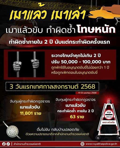 เมื่อวันที่ 14 เมษายน 2568 พล.ต.ท.นิธิธร จินตกานนท์ ผู้บัญชาการศึกษา ในฐานะหัวหน้าคณะทำงานฝ่ายเสริมสร้างภาพลักษณ์ตำรวจจราจร ศูนย์บริหารงานจราจร สำนักงานตำรวจแห่งชาติ เปิดเผยว่า ตามที่ศูนย์อำนวยการป้องกันและลดอุบัติเหตุทางถนน สำนักงานตำรวจแห่งชาติ สรุปการเกิดอุบัติเหตุช่วงเทศกาลสงกรานต์ 2568 สะสม 3 วัน (11-13 เมษายน 2568) มียอดจับกุม เมาแล้วขับสูงถึง 11,801 ราย ซึ่งในจำนวนนี้มีผู้ที่ถูกตรวจพบว่าเป็นการกระทำผิดซ้ำ ภายใน 2 ปี นับแต่วันที่กระทำความผิดครั้งที่ผ่านมา มากถึง 63 ราย