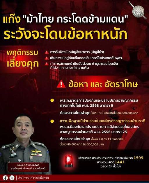 สำนักงานตำรวจแห่งชาติจึงขอเตือนพี่น้องประชาชนที่คิดจะแสวงหาประโยชน์โดยมิชอบ จากการรับจ้างเปิดบัญชีธนาคาร (บัญชีม้า) และเดินทางไปอยู่กับแก๊งคอลเซ็นเตอร์ในประเทศเพื่อนบ้าน เพื่อทำการสแกนหน้ายืนยันตัวตนในการทำธุรกรรมโอนเงินที่ได้จากการกระทำความผิด
