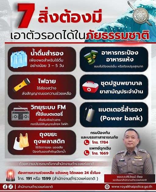 สำนักงานตำรวจแห่งชาติ จึงขอแนะนำพี่น้องประชาชน เกี่ยวกับ 7 สิ่งที่ต้องมี เพื่อเตรียมรับมือและเอาตัวรอดจากภัยธรรมชาติ ดังนี้