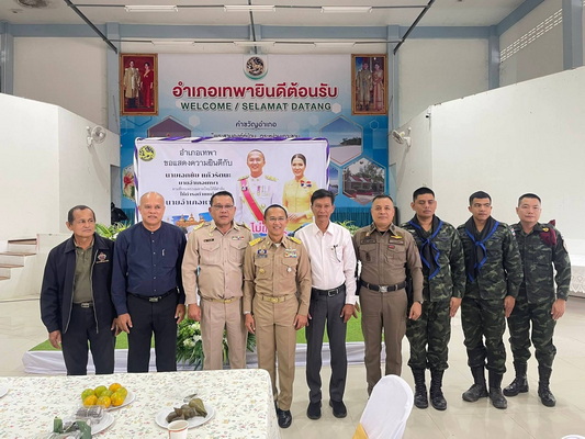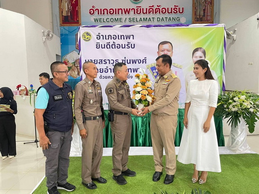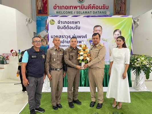 และร่วมต้อนรับ มอบช่อดอกไม้ที่ระลึกให้กับ นายสราวุธ ซุ่นพงศ์ นายอำเภอกระแสสินธุ์ รับการแต่งตั้งดำรงตำแหน่ง นายอำเภอเทพา