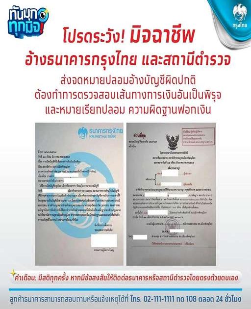 โปรดระวัง! มิจฉาชีพ อ้างธนาคารกรุงไทย และสถานีตำรวจ ส่งจดหมายปลอมอ้างบัญชีผิดปกติต้องทำการตรวจสอบเส้นทางการเงินอันเป็นพิรุธ และหมายเรียกปลอม ความผิดฐานฟอกเงิน