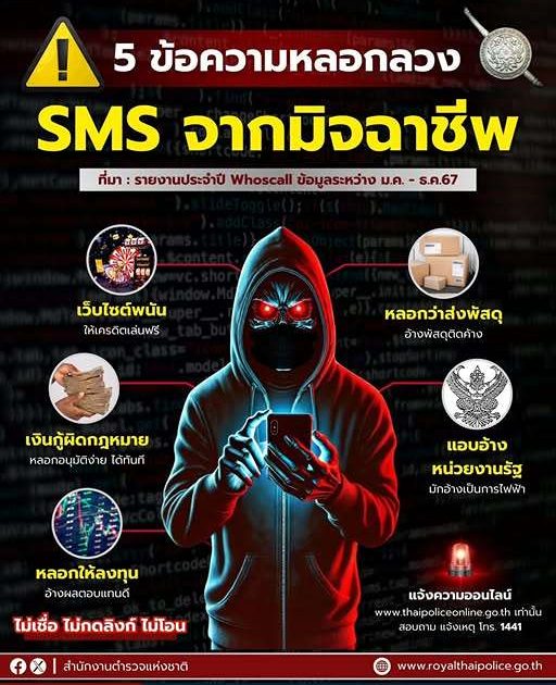 ⚠️ ระวัง 5 ข้อความ SMS 12 มีนาคม 2568 โดย thepha / ข่าวประชาสัมพันธ์,ข่าวฝากประชาสัมพันธ์ ระวัง 5 ข้อความ SMS ทรงมิจฯ ส่งมาหลอกให้คลิก กดลิงก์ หลอกแชต ลวงให้โอนเงิน เว็บไซต์พนัน หลอกว่าส่งพัสดุ เงินกู้ผิดกฎหมาย หลอกให้ลงทุน แอบอ้างหน่วยงานรัฐ . ข้อความประเภทนี้มักแนบลิ้งก์ จูงใจด้วยข้อความชวนให้ตกใจ สงสัย อยากลุ้น อยากได้ เมื่อเผลอกดลิงก์ จะลวงให้แชต หว่านล้อมหลอกล่อให้โอนเงินให้ หรือให้ร่วมกิจกรรมต่าง ๆ ท้ายที่สุด มิจฯ จะขโมยเงินในบัญชี ขโมยข้อมูล  #ไม่เชื่อไม่กดลิงก์ไม่โอน ขอบคุณข้อมูล : Whoscall #เตือนภัยออนไลน์ #สำนักงานตำรวจแห่งชาติ #Royalthaipolice